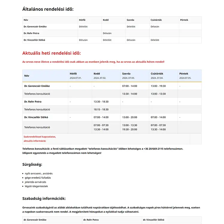 A rendelési idők megjelenítésének automatizálásához szükséges volt egy egyedi plugin fejlesztése. A BSI által kezelt orvosok – rendelési idők – szakrendelések párosításainak lekérdezéséhez és megjelenítéséhez készült egy több ezer soros egyedi kód. Használata mégis rendkívül egyszerű: csupán be kell illeszteni a szakrendeléshez tartozó [shortcode]-ot az adott helyre és már meg is jelenik az automatikusan frissülő rendelési idő táblázat.